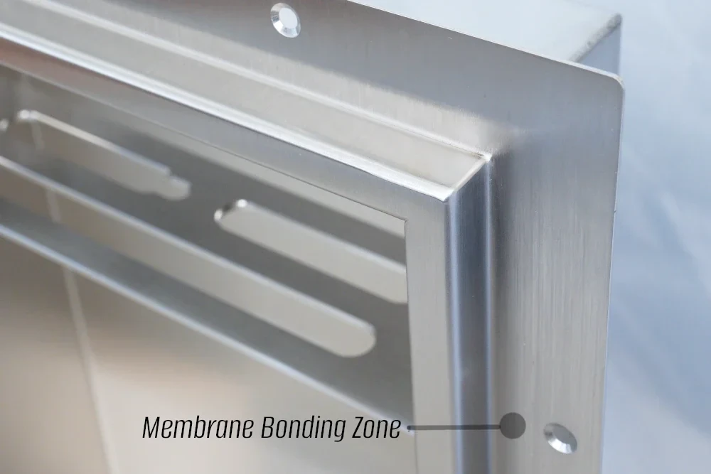 The M-Block™ flange has a dual functionality. It extends around the perimeter of the niche, providing a surface on which to attach the shower wall waterproofing membrane, as well as screw holes to attach it firmly to the wall framing. Proper installation technique for a truly waterproof and moisture proof seal.