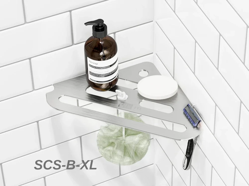 Spacious design for larger showers. Accommodates multiple bottles, and shower accessories.